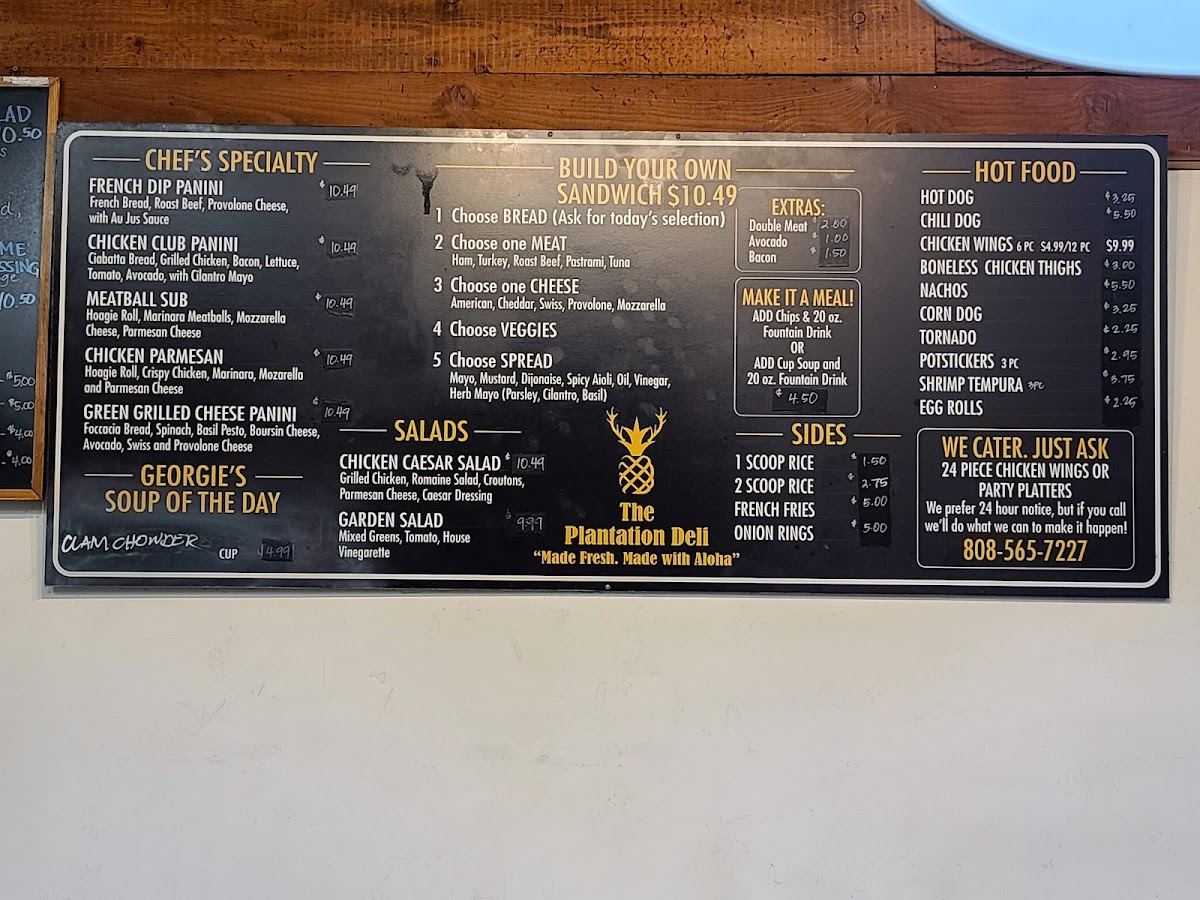 Welcome to The Plantation Deli, a hidden gem nestled within a gas station at 1036 Lanai Ave, Lanai City, HI. This takeout restaurant is redefining quick bites with a menu that shines in flavor and quality. Highlights include the chef's specialties like the French Dip Panini, Chicken Club Panini, and Meatball Sub, all crafted with fresh ingredients for a satisfying experience. Customers rave about the Chicken Panini, noting the soft bread and juicy chicken, while others enjoy the crispiness of the waffle fries and onion rings.